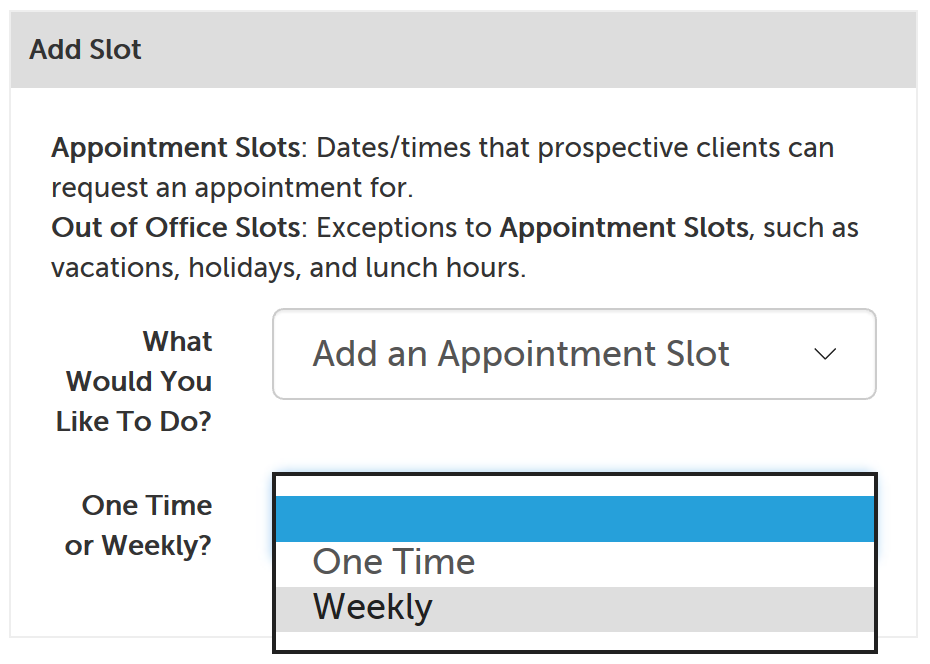 Create a weekly appointment slot if you want to add a recurring appointment slot for a specific day of the week (or multiple days of the week).
